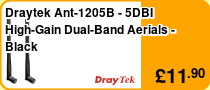 | Draytek ANT-1205. Antenna gain level (max): 5 dBi, Frequency band: 2.4 - 5 GHz, Networking standards: IEEE 802.11a,IEEE 802.11ac,IEEE 802.11ax,IEEE 802.11b,IEEE 802.11g,IEEE 802.11n. Antenna type: Omni-directional antenna, Antenna connector type: RP-SMA, Polarization: Linear polarization. Height: 198 mm, Diameter: 1.3 cm. Quantity per pack: 2 pc(s) |